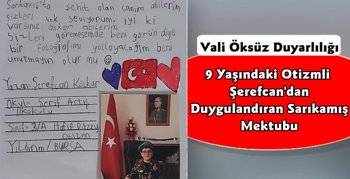 Bursa’da ikamet etmekte olan Şerif Artış İlkokulu üçüncü sınıf öğrencisi hafif otizmli 9 yaşındaki Şerefcan Koçkar, Sarıkamış Şehitlerine bir mektup yazdı.