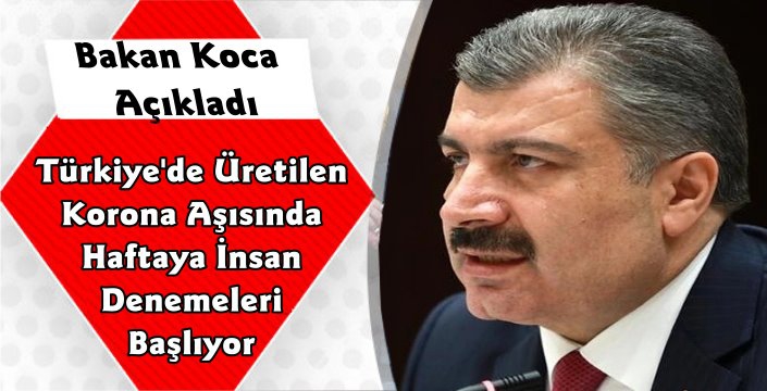 Bakan Koca; " Bunlardan özellikle bir tanesinin geçtiğimiz günlerde Cumhurbaşkanımızada müjdesini verdiğimiz aşı için söylüyorum, inaktif bir aşı brülansıazaltılmış bir aşı, geçen cumartesi gününden bu yana insan çalışmaları için 1000 kişilik dozun üretimine başlandı. Önümüzdeki pazartesi salı günü Bin kişililik dozun üretimi tamamlanmış olacak. Satabilizasyonu önemli, 45 derecede stabilizasyonu sağlayıp sağlamadığıda görülmüş olacak. Üretim tamamlandıktan sonra yani gelecek pazartesi ve ya salı gününden sonra denekler üzerinde gönünllüler üzerinde bu aşının Faz-1 uygulaması başlamış oalcak. Bu uygulama için düşünülen kişi sayısı 44, Faz-1 ilk etapte 44 kişide uygulanacak devamında Faz-2 yüzlerle ifade edilen sayıda uygulanacak. Aşının güvenlirliği ve dozu için çalışmalar olacak. Faz-3 dünya genelinde bir çalışma olacak. Deneklerin 5 günlük karantina süresi olacak. Bu süreç iki haftalık bir zamanda olacak. Önümüzdeki bir aylık süre içerisinde de diğer iki aşınında insan uygulama safhasına geçmiş olacağız. " ifadelerine yer verdi.