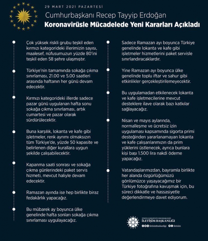 Toplantı sonrasında Cumhurbaşkanı Erdoğan koronavirüs tedbirleri kapsamında alınan yeni kısıtlama kararlarını açıkladı. Cumhurbaşkanı Erdoğan'ın konuşmalarından satır başları şu şekilde; "Kırmızı kategorideki çok yüksek riskli illerimizin sayısı 58'e ulaştı. Türkiye'nin tamamında sokağa çıkma sınırlaması 21.00 - 05.00 olarak haftanın her günü devam edecektir.