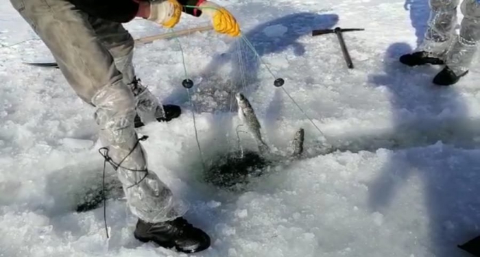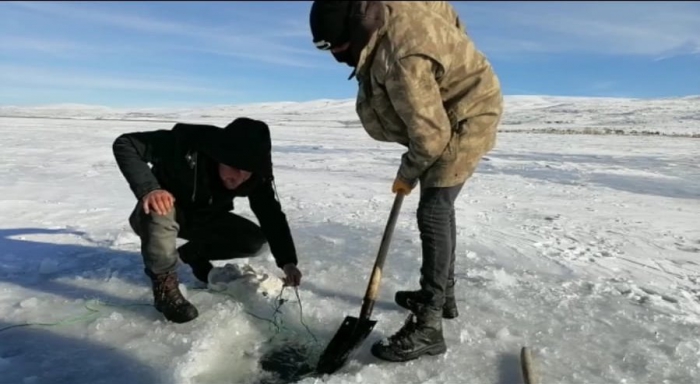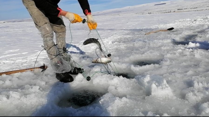 Kars Güncel- Çıldır Gölü kenarında bulunan Yunusun Yeri aldı işletme görevlisi Durul Daşdemir ve beraberindekiler göl yüzeyinde ki buzu kırarak bıraktıkları ağları çektiler. Dondurucu derecede olan soğuk havaya rağmen geçimlerini gölden tuttukları balıklarla sağlayan balıkçıların ağları dolu olunca çektikleri zorlukları da unutuyorlar.