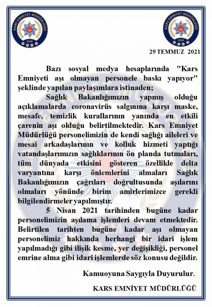 Kars Emniyet Müdürlüğü personellerimizin de kendi sağlığı aileleri ve mesai arkadaşlarını ve kolluk hizmeti yaptığı vatandaşlarımızın sağlıklarını ön planda tutmaları tüm dünyaya etkisini gösteren özellikle de delta varyantına karşı önlemleri almaları sağlık bakanlığımızın çağları doğrultusunda aşılarını olmaları yönünde birim amirlerimizce gerekli bilgilendirmeler yapılmıştır.
