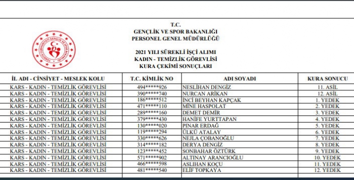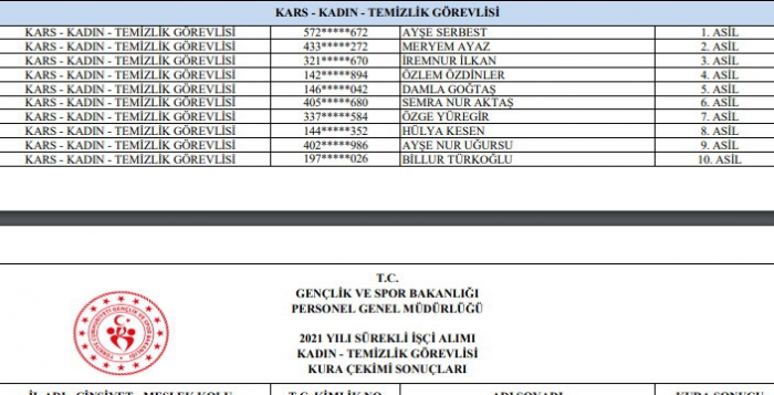 Kars Güncel- Gençlik ve Spor Bakanlığı 4346 sürekli işçi alımı için ilana çıkmış, ardından adaylar başvurularını internet üzerinden gerçekleştirerek kura çekimi 15 Eylül 2021 tarihinde noter huzurunda kura çekimi gerçekleştirilmişti.