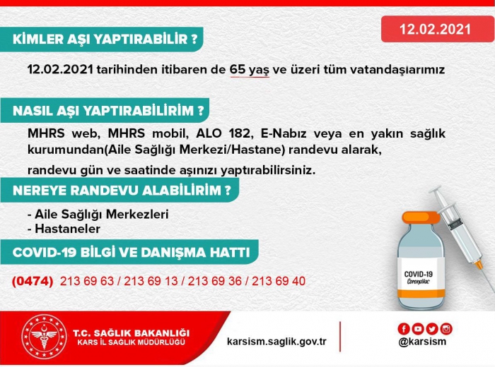 Kars Güncel- Kars İl Sağlık Müdürü Uzm. Dr.Zakir Lazoğlu Covid-19 salgını ile mücadele kapsamında tüm Türkiye’de olduğu gibi ilimizde de 14 Ocak 2021 tarihinde başlayan ve kademeli olarak ilerleyen aşılama programında bugün itibari ile başlatılan 65 yaş üzeri vatandaşların aşılanması ile ilgili açıklamalarda bulundu.