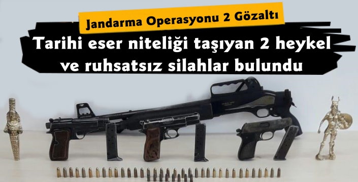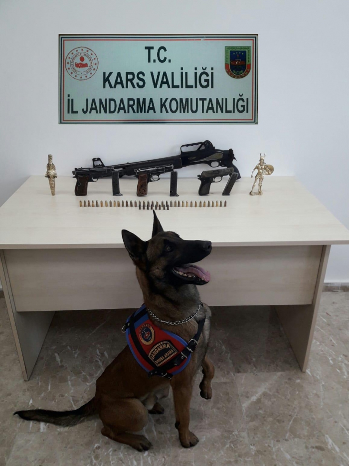 Kars Güncel- Valiliktenyapılan açıklamada; "İl Jandarma Komutanlığımız tarafından alınan bir ihbar üzerine 07.11.2020 tarihinde Digor İlçesi mülki sınırları içerinde önceden tespit edilen 2 evde yapılan aramada 1 adet kurusıkı olmak üzere 3 adet ruhsatsız tabanca, 1 adet ruhsatsız av tüfeği, 2 adet tarihi eser niteliği taşıdığı değerlendirilen heykel ve silahlara ait 43 adet mühimmat ele geçirilmiştir.