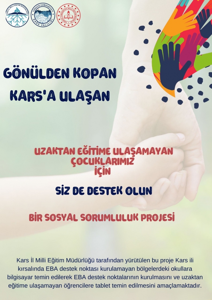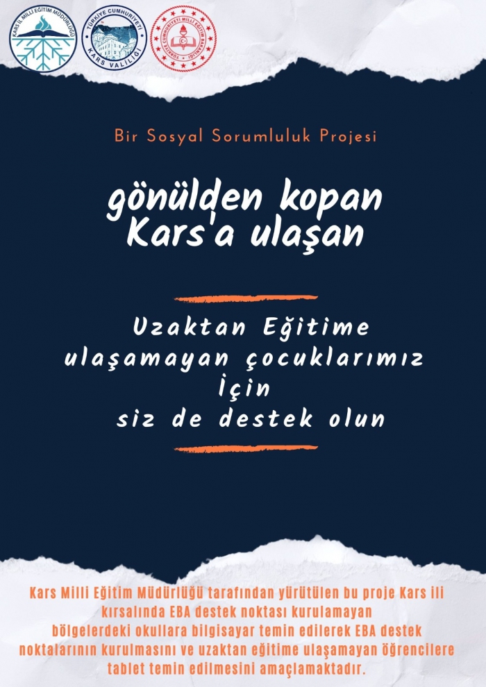 EBA destek noktası olmayan köylerdeki okullara bilgisayar temin etmeyi amaçlayan proje açık arttırma yoluyla öğrencilerin yapacağı ürünler karşılığında bilgisayar hibesi almayı hedeflemektedir. Kars Valiliği tarafından onay alan projenin açık arttırmasına siz de destek verin. En az bir bilgisayar hibesi ile katılımın mümkün olacağı açık arttırmaya katılmak için aşağıdaki formu doldurmanız veya proje irtibat kişisi ile bağlantıya geçmeniz gerekmektedir." ifadelerine yer verildi.