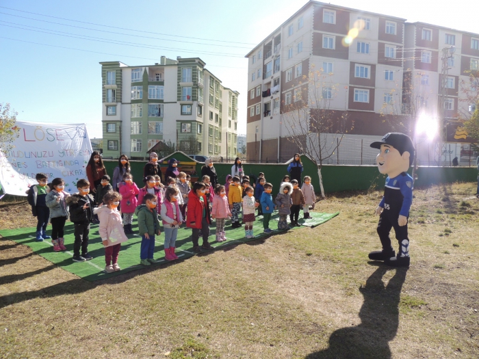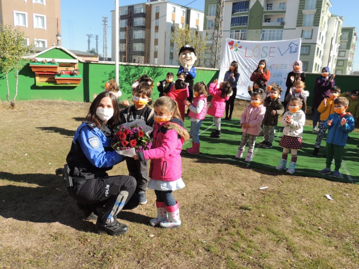Etkinlikte anaokulu öğrencilerine TDP maskotu çeşitli eğlence ve bilgilendirme yaparken, polis ekiplerine öğrenciler tarafından çiçek verildi.