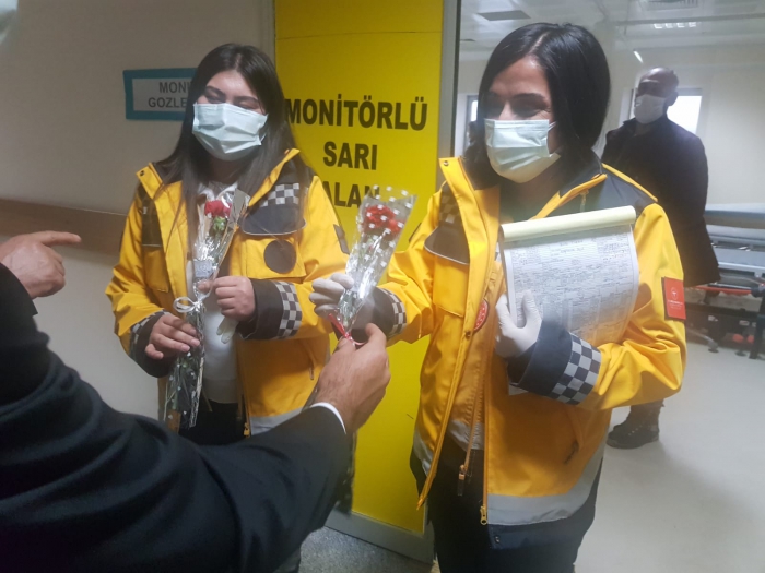 STH Kars Yönetimi, ziyaretlerinde sağlık çalışanlarına "Elif, vav" tablosu hediye ederek karanfil dağıttı.