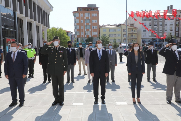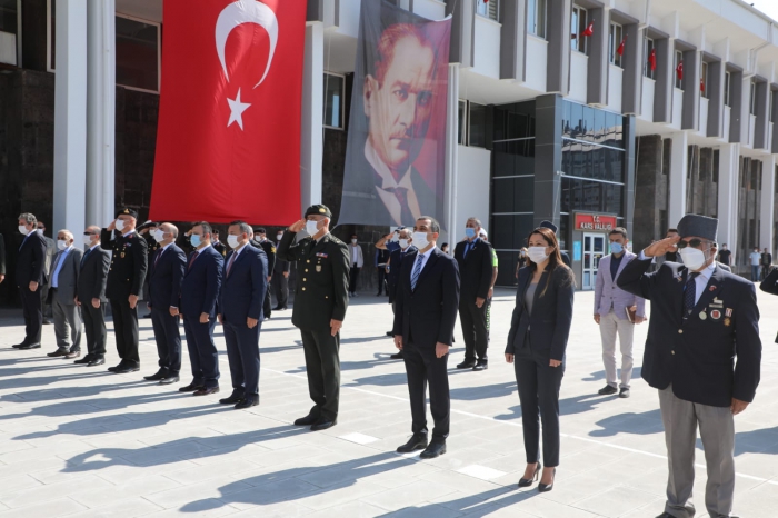 Hükümet Konağı önündeki Atatürk Anıtına Valilik Makamı, Garnizon Komutanlığı ve Belediye Başkanlığı çelenklerinin sunumu ile başlayan tören, saygı duruşu ve İstiklal Marşımızın okunması ile devam etti.
