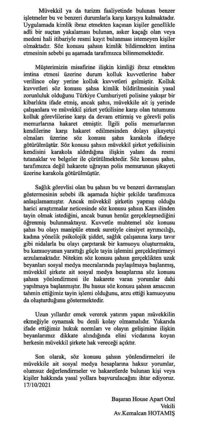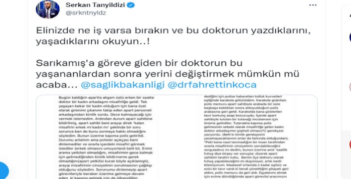 Kars Güncel- Kars'ın Sarıkamış ilçesinde görev yapan ve ilçede bir apart dairede kalan bayan doktor ile apart görevlileri arasında yaşanan olay sosyal medyada geniş yer buldu.