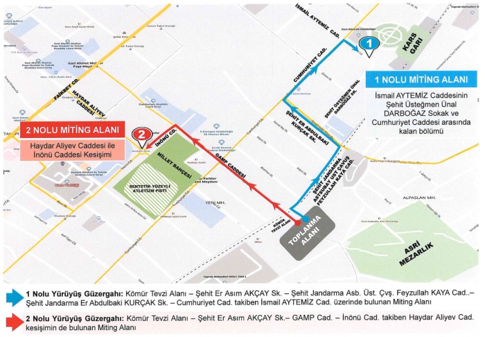 2. Güzergah: Toplanma yeri olan Kömür Tevzii karşısındaki boş alandan Şehit Er Asım Akçay Sokak, GAMP Caddesi, İnönü Caddesi takiben Haydar ALİYEV Caddesinin kesiştiği alan 2 nolugösteri yürüyüşü güzergahıdır.