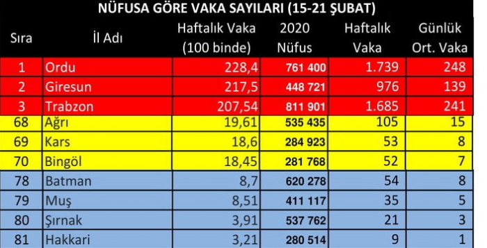 Kars Güncel- Habertürk gazetesinde yer alan haberde Sağlık Bakanlığı'nın 15-21 Şubat tarihleri için açıkladığı tabloda ki veriler, illerin nüfus sayılarına oranlanarak günlük ve haftalık vaka sayıları hesaplandı.