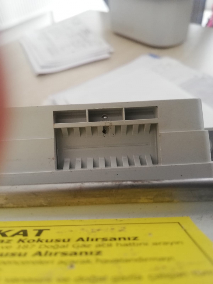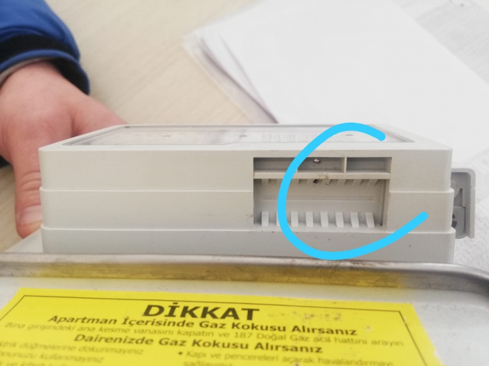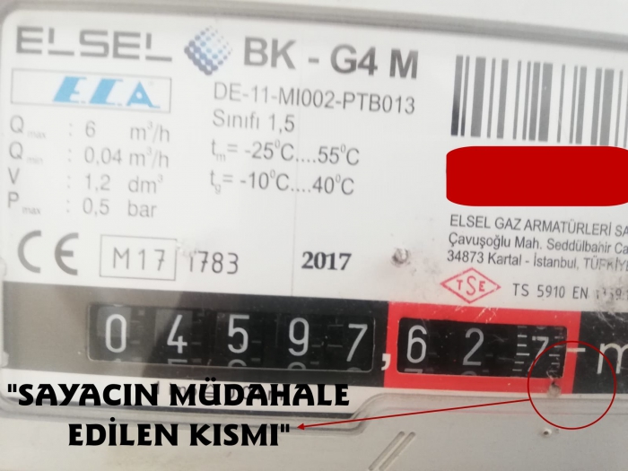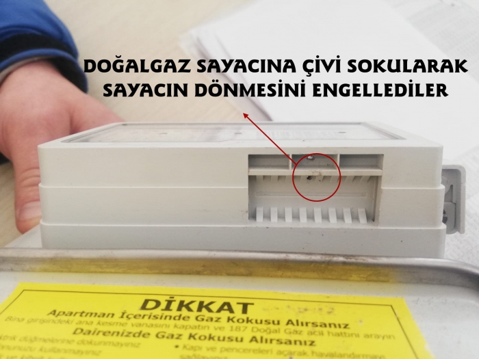 Kargaz görevlileri vatandaşa doğalgaz sayacına yapılan usulsüz müdahaleyi göstererek, "Sayacın içerisindeki endks okuyan alana sayaç dışından "Çivi" çakılarak sayacın dönmesinin engellendiğini gösterdi.