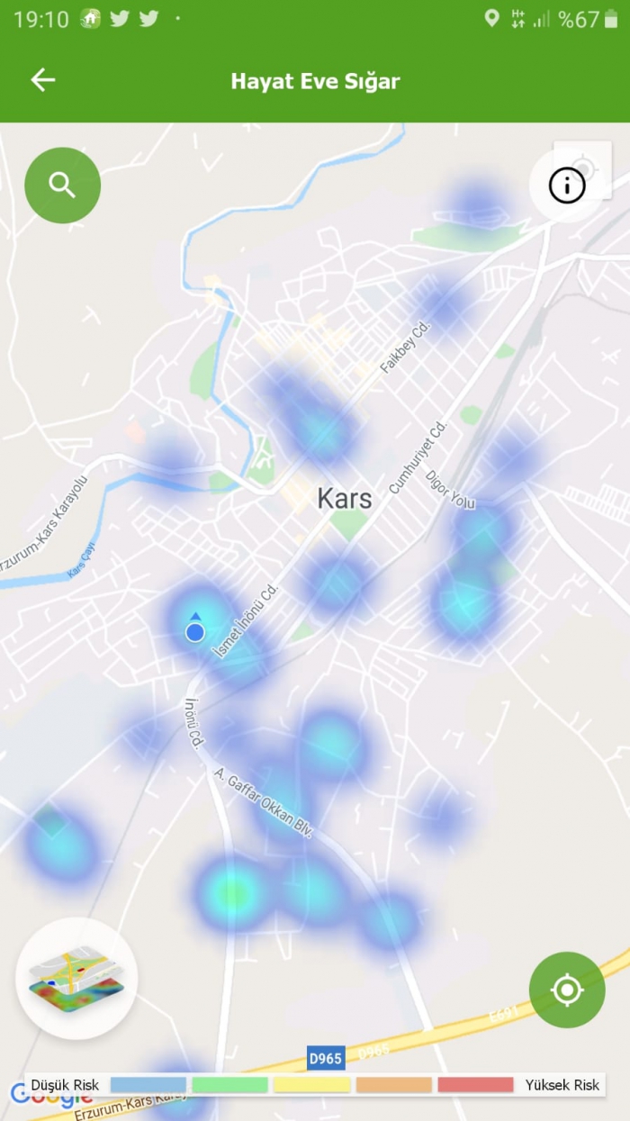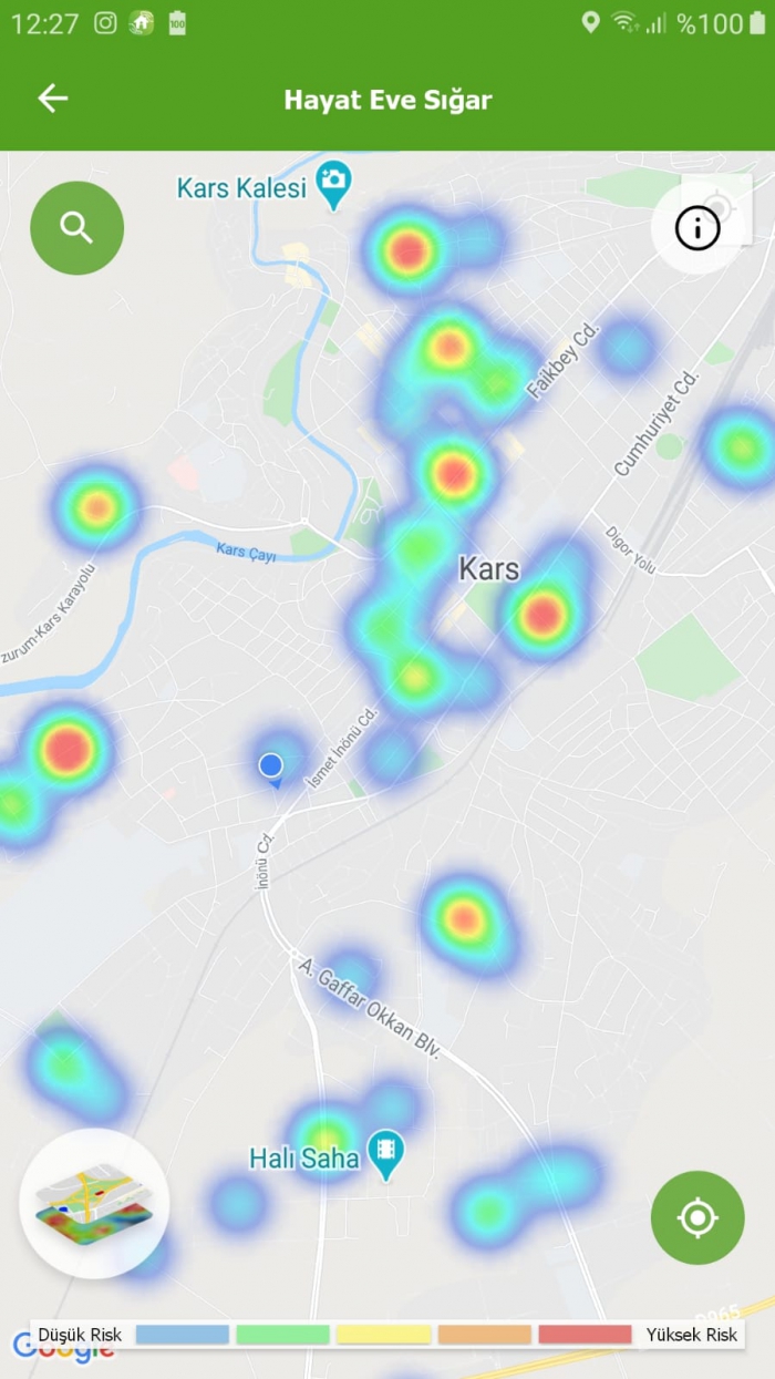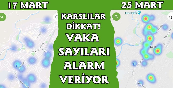 Kars Güncel-Sağlık Bakanlığı’nın Covid-19 salgınında riskli bölgeleri gösterdiği ‘Hayat Eve Sığar’ mobil uygulamasında Kars'ta ki değişim korkutuyor. Koronavirüs yayılımını ve riskli bölgeleri gösteren uygulamada özellikle kentte merkez mahallelerde vaka sayılarının arttığı görülüyor.