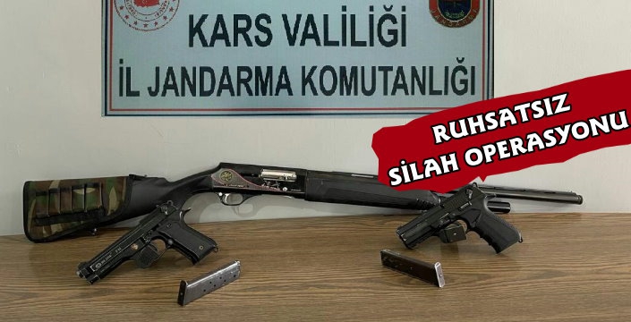 Kars Güncel- Valilikten yapılan açıklamada; "İl Jandarma Komutanlığımız tarafından20. 04. 2021 tarihinde Arpaçay İlçesi sınırları içerisinde icra edilen operasyonda 1şahsın evinde yapılan aramada, 2 adet ruhsatsız tabanca, 4 adet tabanca şarjörü, 1 adet ruhsatsız av tüfeği ve bu silahlara ait mühimmat ele geçirilmiştir.