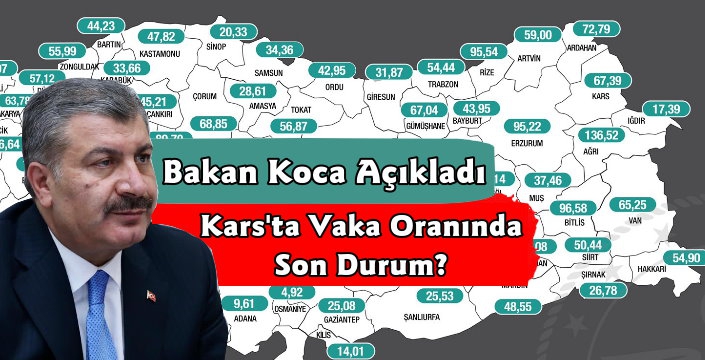 Kars Güncel- Kars Güncel- Sağlık Bakanlığı Türkiye'nin 19-25 Haziran 2021 tarihlerine ait 100 bin nüfusa göre vaka tablosunu açıkladı. Belirtilen tarihlerde Kars'ta vaka yoğunluğu 67,39'e düştü.