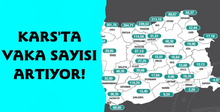Kars Güncel- Sağlık Bakanlığı Türkiye'nin il il 20-26 Şubat tarihlerine ait 100 bin nüfusa göre vaka tablosunu açıkladı. Belirtilen tarihlerde Kars'ta vaka yoğunluğu 22,84'e yükseldi.