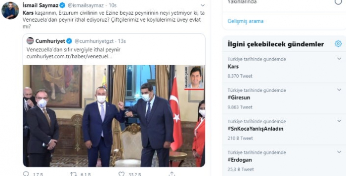 Peynir ve tarımsal ürünlerin Venezuela'dan ithal edilmesini kapsayan karar hakkında gazeteci İsmail Saymaz'ın da twitter paylaşımları yapması sonrasında Kars Türkiye gündeminde Trend Topic (TT) listesinde ilk sıralara girmesine neden oldu.