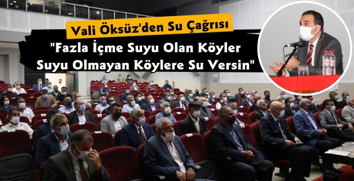 Vali ve Belediye Başkan Vekili Türker Öksüz, toplantıda yaptığı konuşmada fazla içme suyu olan köy muhtarlarına ve halkına uyarıda bulunarak, suyu olmayan köylere su verilmelerini istedi. KÖYDES ve İl Özel İdaresi marifeti ile susuz köy kalmaması için çalıştıklarını söyleyerek, susuz bir hayatın olamayacağını dile getirdi. Vali ve Belediye Başkan Vekili Türker Öksüz ayrıca, İl Özel İdaresi marifetiyle 2020 yılında yapılan ve 2021 yılında yatırım programında olan yol, su, gölet, taziye evi ve köylerin alt yapısı ile ilgi olarak bilgi verdi.
