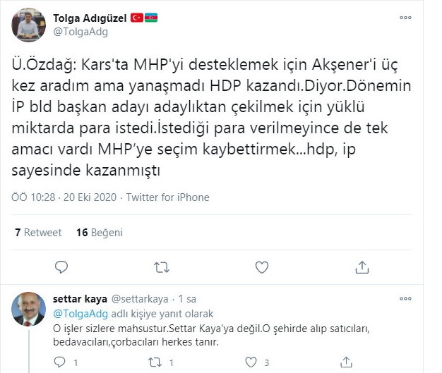 Kars Güncel-İyi Parti İstanbul Milletvekili Ümit Özdağ, CNN Türk'te Ahmet Hakan'ın sunduğu Tarafsız Bölge programında konuştu. Özdağ'ın konuşması sonrasında MHP Kars İl Başkanı Tolga Adıgüzel ve İYİ Parti Kars Belediye Başkan Adayı Settar Kaya'nın sosyal medya üzerinden karşılıklı açıklamalar yapmasına neden oldu.