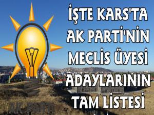 İşte AK Parti Kars Belediye Meclis üyeliği için aday adayı olan isimler; İsmail Gürsoy, Yargıç Harmankaya, Abdurrahman Konu, Taner Nebioğlu, Taner Garipoğlu, Rıdvan Ekinci, Sontürk Mebdi, Hüseyin Kamil Erkoç, Emre Koçali, Cemal Gökçe, Muhlis Kepenekçi, Murat Yılmaz, Ramazan Kaya, Osman Kaya, Serkan Dadaş, Savaş Günce, Tacettin Erdağı, Oktay Koçu, Alattin Polat, Figen Artuk, Mecit Boran, Vokan Ubiç, Aşır Umurbeg, Levent Turan, Soner Tayfun, Volkan Toptaş, Hüseyin Kömek, Ersin Güzeldere, Casim Demir, Menderes Yıldırım, Şahin Aydın, Ömer Gökalp, Hamza Penmek, Haluk Şayir, Ayfer Othan, Fatma Eyyüboğlu, Memet Topçu, İbrahim Çolak, Gazi Atalay, Seyfun Keleşoğlu, Kazım Mücük, Tolhan Mutludeniz, Nurhan Coşkunaras, Cihan Umurbeg, Vesim Bulak, Kemal Güven, Sevim Aslanoğlu, Mahsun Eğinyürek, İsmail Yıldız, Adnan Korhan, Zafer Arslanoğlu, Ali Mutluer, Nahit Koçan, Okay Ulakçı, İsmail Vargün