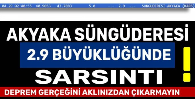 Kars'ın Akyaka ilçesi, Nisan ayının son günlerinde hafif şiddette bir depremle sarsıldı. Kandilli Rasathanesi ve Deprem Araştırma Enstitüsü verilerine göre, merkez üssü Akyaka ilçesine bağlı Süngüderesi köyü olan 2.9 büyüklüğündeki deprem, bugün saat 02.40’ta meydana geldi. Depremin yerin 5 kilometre derinliğinde gerçekleştiği bildirildi.