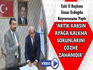 İl Başkanı Adem Çalkın burada yaptığı açıklamada;" Bugün Kars Belediye Başkanlığı aday adaylığı başvurusunu yapan kıymetli büyüğüm eski il başkanım Avukat Ensar Erdoğdu'ya başkanımız olarak bakıyoruz. Rabbim hakkında hayırlısını nasip etsin." diyorum.