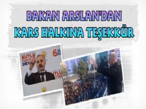 İlk teşekkürünü Karslı vatandaşlara yapan Arslan; "Soğuk, kar, kış dinlemeden saatlerce Cumhurbaşkanımızı bağrına basmak için meydanda bekleyen, bizleri yalnız bırakmayan hemşerilerime ne kadar teşekkür etsem azdır." diyerek, yapılan kongrede güven tazeleyerek yeniden il başkanlığı görevini yürütmeye layık görülen AK Parti Kars il teşkilatı içinde; "Kars il başkanlığına seçilen Adem Çalkın ve yönetimine başarılar dilerken, görevi devreden arkadaşlara teşekkür ediyorum." diyerek teşekkür etti.