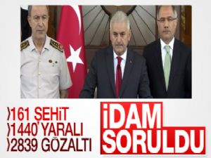 Bu girişimde bulunanlar için yapılacak hukuki işleme ilişkin soruya Yıldırım, "Malum, vahim bir olayın daha sıcaklığı devam ediyor. Tutuklamalar, gözaltılar devam ediyor, henüz tamamlanmış değil. İkincisi de tabii bu işlenen bu suçun karşılığı hukuk sisteminde yargı sisteminde adalet sistemimizde açık seçik tanımlanmıştır. Bilindiği gibi idam cezası Türk anayasasından çıkarılmıştır, bugün Yüce Meclisimiz toplanacak ve burada ülkenin bu ve buna benzer çılgınlıklarla karşı karşıya kalmaması için ilave ne gidi tedbirler alınacaksa bunları diğer parti liderleri ile değerlendireceğiz. İlk bilgilere göre darbecilerden de 20 civarında ölen var, 30'a yakın da yaralı var. ilerleyen saatlerde gerçek rakamlar ortaya çıkacaktır. Rakamlar bağlayıcı değil. Tespit edilenler ifade edilmiştir" karşılığını verdi.
