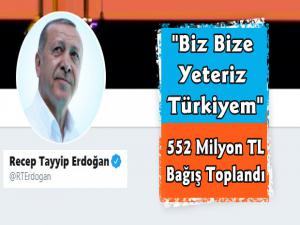 Kars Güncel- Cumhurbaşkanlığı İletişim Başkanı Fahrettin Altun tarafından yapılan açıklamada; "Cumhurbaşkanımızın Biz Bize Yeteriz Türkiyem çağrısıyla başlattığı milli dayanışma kampanyamızda şimdiye kadar 552.529.912₺ toplandı.