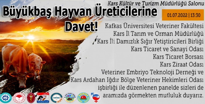 Kars Tarım ve Orman İl Müdürlüğü, Kafkas Üniversitesi Veteriner Fakültesi, Kars Ticaret Odası, Kars Ziraat Odası, Kars Ticaret Borsası, Veteriner Embriyo Teknoloji Derneği, Kars İli Damızlık Sığır Yetiştiriciler Birliği ile Kars, Ardahan, Iğdır Bölgesi Veteriner Hekimleri Odası işbirliği ile büyükbaş hayvanlarda dölverimi sorunu hakkında panel düzenlenecek.