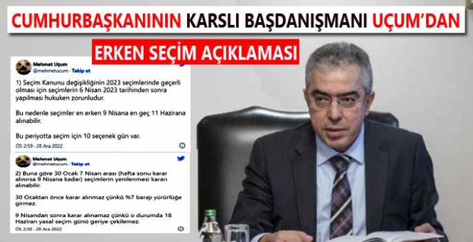 Cumhurbaşkanı Başdanışmanı ve Cumhurbaşkanlığı Hukuk Politikaları Kurulu Başkanvekili Uçum, Twitterdan yaptığı açıklamada, "Seçim Kanunu değişikliğinin 2023 seçimlerinde geçerli olması için seçimlerin 6 Nisan 2023 tarihinden sonra yapılması hukuken zorunludur. Bu nedenle seçimler en erken 9 Nisana en geç 11 Hazirana alınabilir. Bu periyotta seçim için 10 seçenek gün var" dedi.