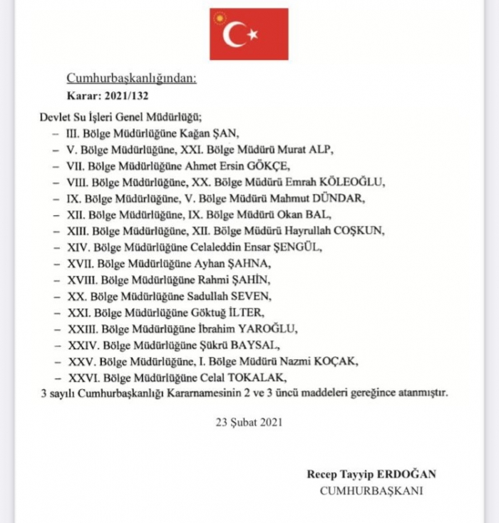 Kars Güncel- Yaklaşık yedi aydır DSİ 24. Bölge Müdürlüğü görevini vekâleten yürüten Bölge Müdürü Şükrü Baysal, 24 Şubat 2021 tarihli Resmi Gazete yayınlanan 2021/132 sayılı Cumhurbaşkanlığı Kararı ile 3 sayılı Cumhurbaşkanı Kararnamesinin 2 ve 3 üncü maddeleri gereğince Kars, Iğdır, Ardahan illerinden sorumlu DSİ 24. (KARS) Bölge Müdürlüğü görevine asaleten atandı.