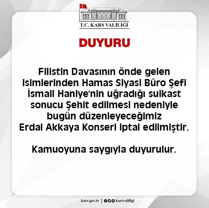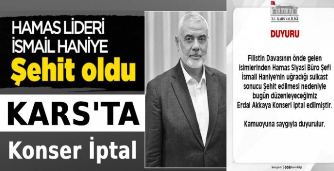 Kars Valiliği'nden yapılan duyuruda :"Filistin Davasının önde gelen isimlerinden Hamas Siyasi Büro Şefi İsmail Haniye'nin uğradığı suikast sonucu Şehit edilmesi nedeniyle bugün düzenleyeceğimiz Erdal Akkaya Konseri iptal edilmiştir. Kamuoyuna saygıyla duyurulur." denildi.