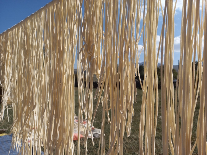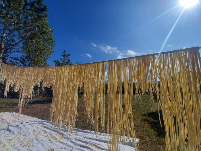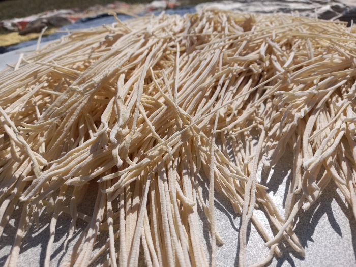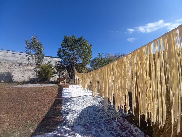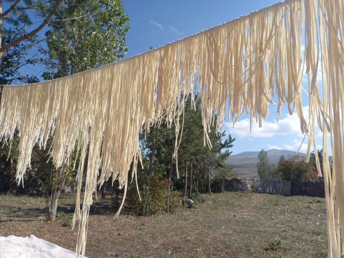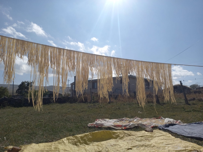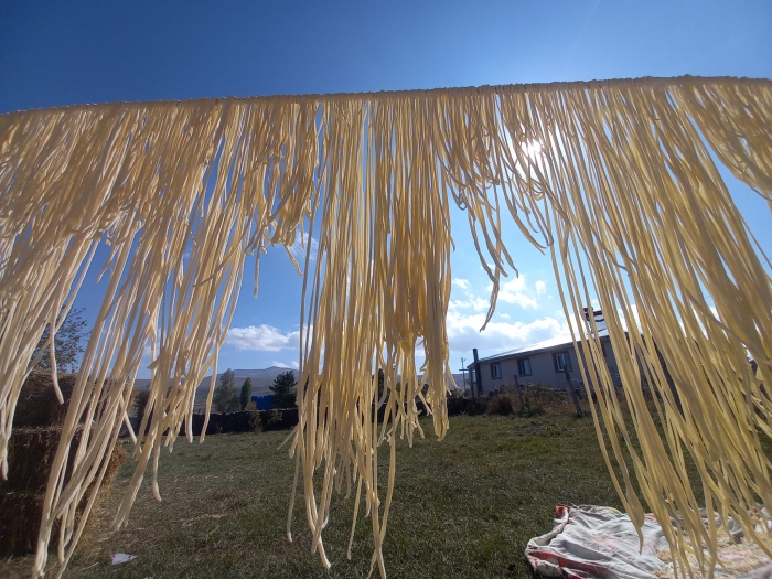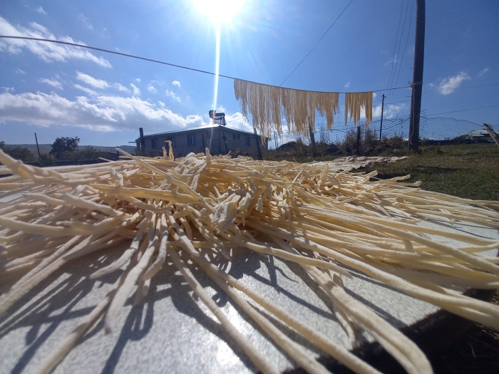 Kars'ın kış makarnası olarak bilinen 'Gün Eriştesi' kurutulmak için güneşin karşısında sergilenmeye başlandı.