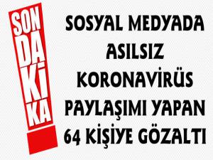 Kars Güncel- İçişleri Bakanlığı tarafından yapılan duyuruda; "Sosyal medyada asılsız ve provokatif Coronavirüs paylaşımları yapan 242 şüpheli tespit edildi, 64'ü gözaltına alındı.