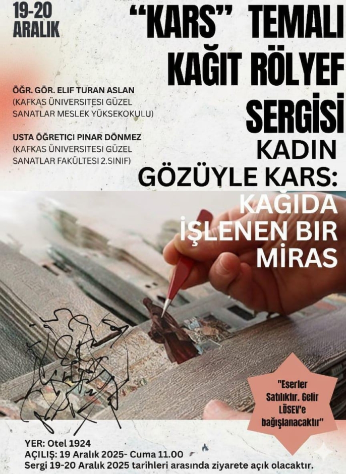 Kars’ın kültürel mirası, kadın sanatçıların bakış açısıyla kağıt rölyef çalışmaları aracılığıyla sanatseverlerle buluşuyor. “Kars” temalı Kağıt Rölyef Sergisi, 19–20 Aralık 2025 tarihleri arasında Kars’ta ziyaret edilebilecek.