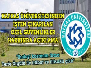 Kars Güncel- Kafkas Üniversitesinin yaptığı açıklamada "Milli Güvenlik Kurulunca Devletin milli güvenliğine karşı faaliyette bulunduğuna karar verilen yapı, oluşum ya da gruplar ile iltisakı veya irtibatı olduğu yönünde İçişleri Bakanlığınca Ülkemiz genelinde faaliyet gösteren özel güvenlik şirket ve eğitim kurumları ile kurucu ve yöneticiler hakkında yapılan araştırma ve inceleme neticesinde terör örgütüne aidiyeti, iltisakı veya irtibatı tespit edilen ve Üniversitemize 4734 sayılı Kanun kapsamında özel güvenlik alanında hizmet sunan firmanın İçişleri Bakanlığınca " Özel Güvenlik Faaliyet İzin Belgesi " iptal edildiğinden, Üniversitemize özel güvenlik hizmeti sunan firmanın sözleşmesi iptal edilmiştir. Bu bağlamda; Üniversitemizin özel güvenlik hizmetlerinin aksamaması ve çalışanlarımızın mağdur olmaması için Rektörlüğümüzce 4734 sayılı Kanunun ilgili maddeleri uyarınca ivedilikle yeni ihale süreci başlatılmıştır. Kamuoyuna saygı ile duyurulur." denildi.