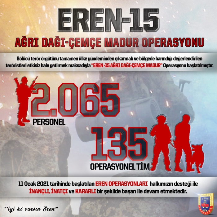 Yurt içinde terörün tamamen ortadan kaldırılmasına yönelik yürütülen Eren Operasyonları, halkımızın desteği ile inançlı, inatçı ve kararlı bir şekilde başarı ile devam etmektedir." denildi.