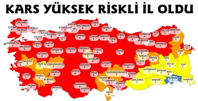 Kars Güncel-Bakan Koca yaptığı açıklamada;"İllerimizin risk durumunu gösteren son haritamız. Virüs gücünü kaybetmiş değil. Bu haritayı maviye çevirmek elimizde. Aşı programı toplum bağışıklığını sağlayana kadar mücadele etmeliyiz. Zor olanı aştık kolay olanı kaybetmeyelim."dedi.