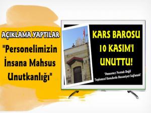 Kars Barosunun gerek milli gerekse dini hassasiyetlere gösterdiği dikkat ve özen kamuoyu tarafından bilinmekte iken bir kısım yerel haber sitelerinde Kars Barosu 10 Kasımı Unuttu başlığı ile yayınlanan haberi üzüntü ile karşıladık. Çünkü Bayrağımızın yarıya çekilmemesi konusu bilinçli olarak değil baro personelimizin insana mahsus bir unutkanlığı sonucu olmuş, ilgili personele gerekli uyarılar yapılmıştır.