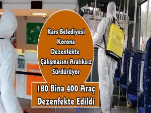 Kars Belediyesi virüs tedbirlerini başlattığı günden bugüne kadar, şehirde vatandaşların temas ettiği 180 kamu kurum ve kuruluşu hizmet binası başta olmak üzere, banka ve diğer kamusal alanlar ile birlikte 400 adet de kamu ve toplu taşıma aracı dezenfeksiyon işlemi gerçekleştirdi.Kent genelinde dezenfeksiyon işlemi yürüten ekipler, haftaiçi ve hafta sonu gece geç saatlere çalışmalarını aralıksız sürdürüyor.
