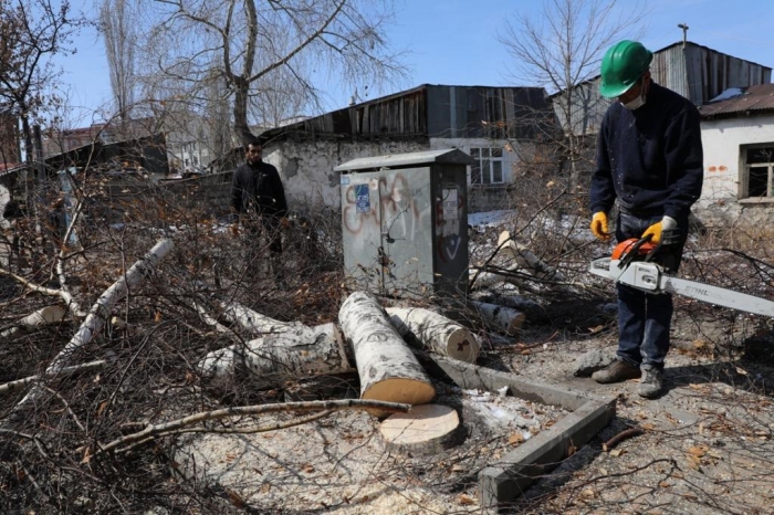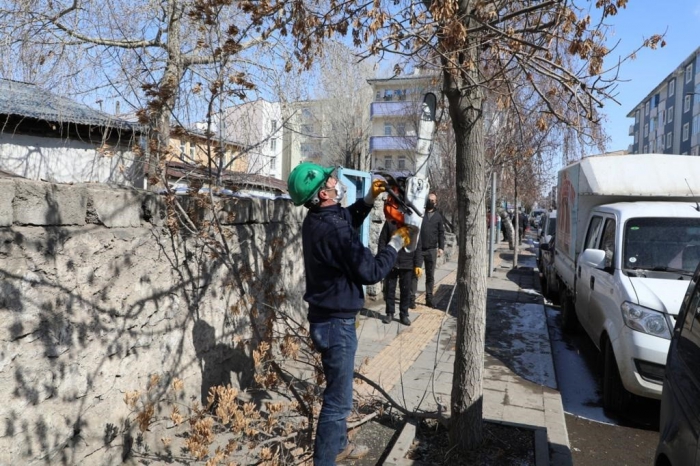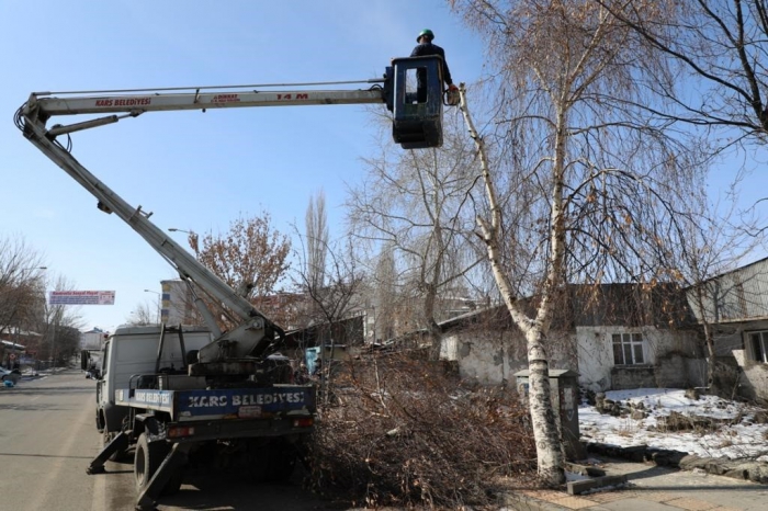Kars Günel- Belediye ekipleri ağaçların sağlıklı şekilde gelişmesi ve olumsuz hava koşullarından etkilenmemesi için kent genelinde belirlenen alanlarda ağaç budama çalışması başlattı.