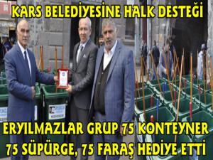 Kars Belediyesi temizlik işlerinden sorumlu Belediye Başkan yardımcısı Ferit Yenice ve Temizlik işleri Müdürü Kemal Özyılmaz, Eryılmazlar Grubun yapmış olduğu bu anlamlı destekten dolayı firma sahibi Hüseyin Eryılmazlar'a plaket verip teşekkürlerini ilettiler.