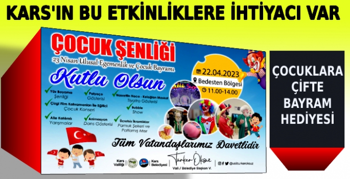 Vali/Belediye Başkan Vekili Türker Öksüz'ün talimatları doğrultusunda Ramazan Bayramı ve 23 Nisan Ulusal Egemenlik ve Çocuk Bayramı münasebetiyle Kars Belediyesi tarafından çocuklarımız için Çocuk Şenliği Etkinliği düzenleniyor.