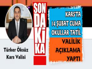 Kars Güncel- Kars Valiliği'nden yapılan açıklamada; "Olumsuz hava koşulları sebebiyle ilimiz genelindeki tüm okullarımız 14 Şubat 2020 Cuma günü bir gün süreyle tatil edilmiştir. Kamu kurumlarında görevli engelli ve hamile personel de bir gün idari izinli sayılacaktır." denildi.
