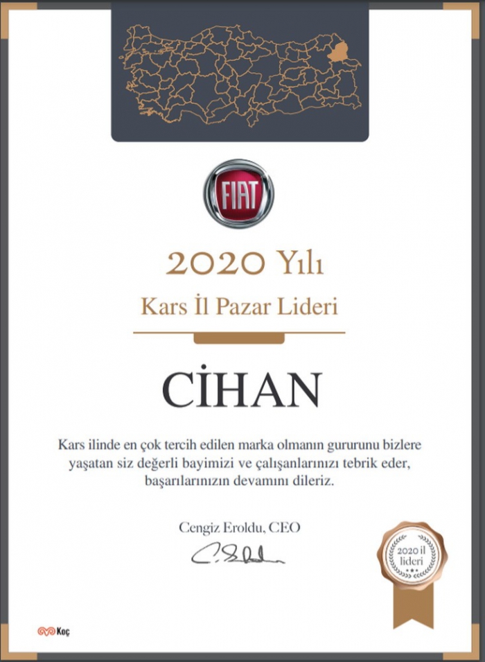 Fiat’ın KARS’daki güçlü temsilcisi CİHAN Yönetim Kurulu Başkanı Hüsamettin Yavuz ise “2020 TÜİK verilerine göre müşterilerimizin teveccühü ile toplam araç satışında Kars Pazar lideri olduk. Başta Kars‘taki müşterilerimiz olmak üzere Ardahan, Iğdır ve Ağrı’daki tüm müşterilerimize teşekkür ediyorum. Bu başarıda büyük emeği olan tüm çalışan arkadaşlarımı da tebrik ediyor başarılarının devamını diliyorum. Yeni ürünler gücümüze güç kattı. Özellikle 2015 yılında çıkan Egea aralıksız olarak tek başına tüm markalar içerisinde liderliğini sürdürmekte. Teknolojiyi, tasarımı, konforu,güvenliği ve uygun fiyatı ile müşterilerimizin en çok tercih ettiği Egea ile beraber2021 yılında Yeni Egea Cross modeli ile bu yıl da en çok tercih edilen marka ve model olan Fiat’a katkı sağlayacaktır. Bu güzel ürünler için de tüm Tofaş yöneticilerine ve çalışanlarına da teşekkür ediyorum. Bu yeni ürünler için de siz değerli müşterilerimi bayimize beklemekteyiz. TEŞEKKÜRLER KARS. TEŞEKKÜRLER FIAT. ” diye konuştu.