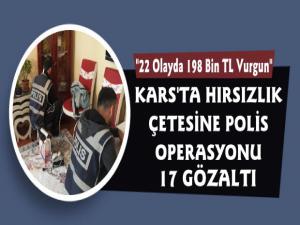 Kars Güncel-Kars Emniyet Müdürlüğünden yapılan yazılı açıklamada, "Asayiş Şube Müdürlüğü görevlilerimizce 25/04-19/07/2019 tarihleri arasında İlimizde 22 ayrı ev, işyeri, açıktan ve otodan olmak üzere meydana gelen 198.000 lira değerindeki hırsızlık olayları ile ilgili yapılan 3 aylık fiziki ve teknik çalışmalar sonucunda; 19.07.2019 günü yapılan operasyonda hırsızlık olayını gerçekleştiren ve hırsızlık mallarını satın aldıkları tespit edilen Kars il merkezinde 8 (sekiz), İstanbul ilinde 9 (dokuz), 2si bayan 15i erkek toplam 17 (onyedi) şahıs gözaltına alınmış, ikametlerinde yapılan aramalarda muhtelif ziynet eşyası, beyaz eşya, elektronik eşya, sanayi tipi aletler, oto aksesuarları ve yedek parçaları, cep telefonu ve ev aletleri gibi çok sayıda hırsızlık olaylarına ait çalıntı eşyalar ele geçirilmiş olup adli tahkikat devam etmektedir."denildi.