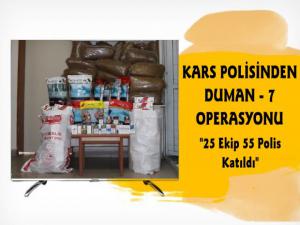 Kars Güncel- Kars İl Emniyet Müdürlüğü'nden Yapılan Yazılı Açıklamada: "Kayıt dışı ekonominin en önemli unsurları arasında yer alan sigara ve tütün kaçakçılığının, ekonomiye olan olumsuz etkisinin azaltılması ve ülkeye kaçak yollarla getirilen sigaranın kontrolsüz ve sağlıksız olarak iç piyasaya dağıtılmasını engellemek amacıyla 11.09.2019 günü Türkiye genelinde 81 ilde eş zamanlı olarak yapılan DUMAN-7 operasyonu, Kaçakçılık ve Organize Suçlarla Mücadele Şube Müdürlüğümüz görevlilerince Kars merkez ve ilçelerimizde 25 ekip ve 55 personelin katılımıyla gerçekleşmiş olup, 40 işyeri kontrol edilmiştir. Yapılan kontroller neticesinde,