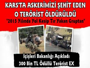Kars Güncel- İçişleri Bakanlığından yapılan açıklamada Ağrı'da gerçekleştirilen terör operasyonundan etkisiz hale getirilen teröristlerden birinin 300 Bin TL ödülle gri listede yer alan ve terör örgütü tarafından Kars'ta 31 Temmuz 2015 yılında düzenlenen hain saldırıda uzman çavuş Ali Gökçe'nin şehit olduğu eylemde bulunarak bölgede yol keserek tır yakma faaliyetlerini gerçekleştirdiği belirtildi.
