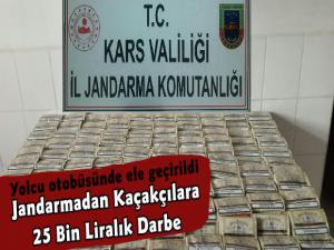 Kars Güncel- Kars Valiliği'nden yapılan açıklamada; "İl Jandarma Komutanlığımız tarafından alınan duyum üzerine 12 Mart 2020 tarihinde Sarıkamış İlçesi Karakurt Köyü mevkiinde icra edilen Yol Kontrol ve Arama Faaliyetinde durdurulan özel bir firmaya ait yolcu otobüsünün bagaj kısmında yapılan kontrolde, faturasız ve bandrolsüz yurda kaçak yollardan girdiği değerlendirilen piyasa değeri 17.400 TL olan toplam 580 paket kaçak sigara tütünü ele geçirilmiştir.